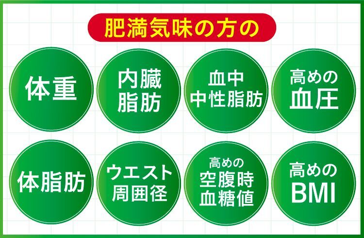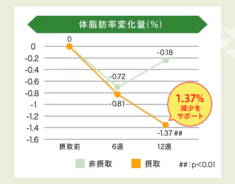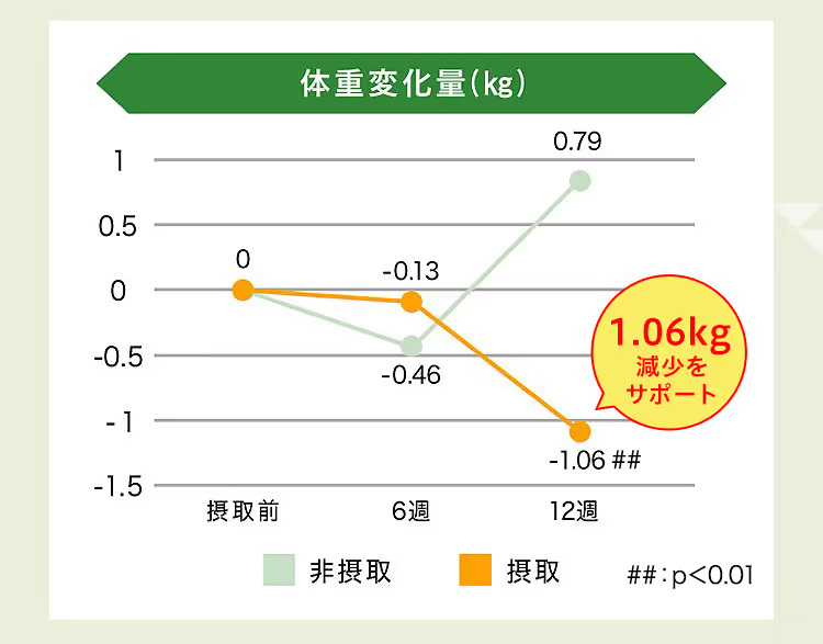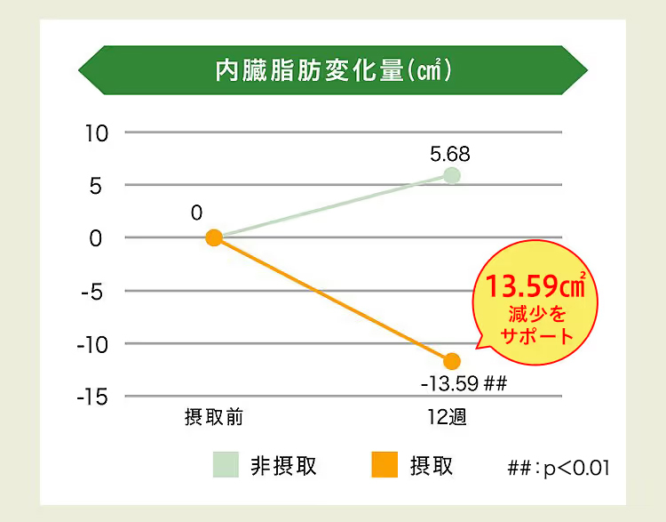 <対象>年齢:20~64歳 性別:男女 肥満気味の方(BMI値25kg/㎡以上30kg/㎡未満)、内臓脂肪が80㎠以上の方(エラグ酸摂取群:15名 / 摂取なし群:17名)